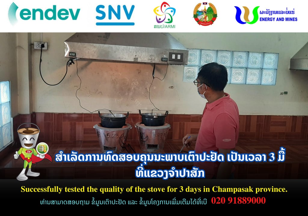 ໃນທຸກໆ 3 ເດືອນ, ພວກເຮົາຈະໄດ້ຊຸ່ມເອົາເຕົາຕົວຢ່າງຂອງແຕ່ລະຜູ້ຜະລິດ ເພື່ອທົດສອບ ໃຫ້ແນ່ໃຈວ່າປະສິດທິພາບຢູ່ໃນເກນມາດຕະຖານທີ່ໄດ້ກຳນົດໄວ້, ໃນລະຫວ່າງວັນທີ 12-14 ກໍລະກົດ 2023, ຢູ່ພື້ນທີ່ຈຳປາສັກ ຮ່ວມກັບ ພະແນກພະລັງງານ ແລະ ບໍ່ແຮ່ ໄດ້ທົດສອບເຕົາ ເປັນເວລາ 3 ມື້ສຳເລັດໄປດ້ວຍດີ ເຫັນວ່າເຕົາທຸກທີ່ນຳມາເຂົ້າທົດສອບແມ່ນມີປະສິດທິພາບໃນເກນມາດຖານ. ເຊິ່ງປະກອບມີເຕົາ ປະຢັດຖ່ານ 9 ໜ່ວຍ, ເຕົາປະຢັດຟືນນ້ອຍ 3 ໜ່ວຍ ແລະ ເຕົາປະຢັດຟືນໃຫຍ່ 2 ໜ່ວຍ, ນອກຈາກນັ້ນ ກໍ່ໄດ້ມີການປັບປຸ່ງທໍ່ດູດຄວັນຢູ່ຫ້ອງທົດສອບອີກດ້ວຍ.